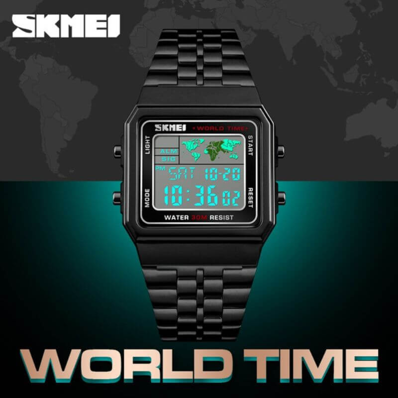 SKMEI 1338 Men’s Stainless Steel Countdown Time Zone Waterproof LED Electronic Digital Watch – Black